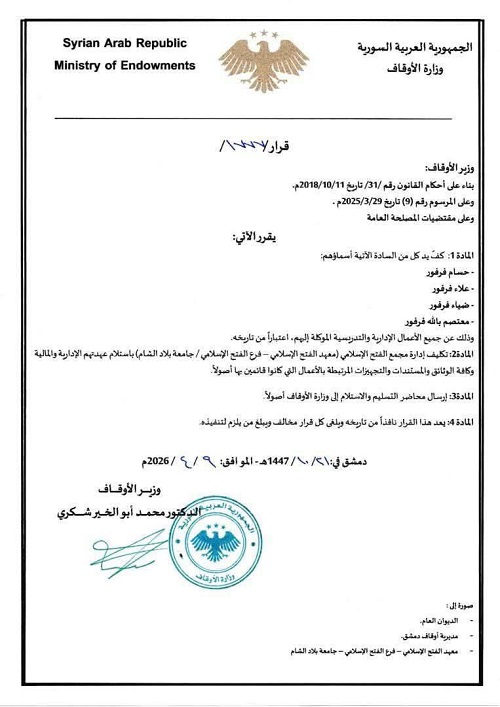 أصدرت وزارة الأوقاف، قراراً يقضي بكف يد عدد من أفراد عائلة "آل فرفور" من إدارة مجمع الفتح الإسلامي في دمشق، وعلى رأسهم حسام الدين فرفور الذي كان مقرباً ومستفيداً من النظام المخلوع. وشمل كف اليد كلاً من حسام الدين فرفور، وعلاء فرفور، وضياء فرفور، ومعتصم بالله فرفور، وذلك عن جميع المهام الإدارية والتدريسية الموكلة إليهم، اعتباراً من تاريخ صدوره، بحسب القرار. ونص القرار على سحب الصلاحيات الإدارية والمالية من المذكورين، مع إلزامهم بتسليم كافة الوثائق والمستندات، وتنظيم محاضر التسليم والاستلام أصولاً، على أن تُرفع إلى وزارة الأوقاف، مشيراً إلى أن القرار نافذ فوراً ويُلغي كل قرار مخالف.