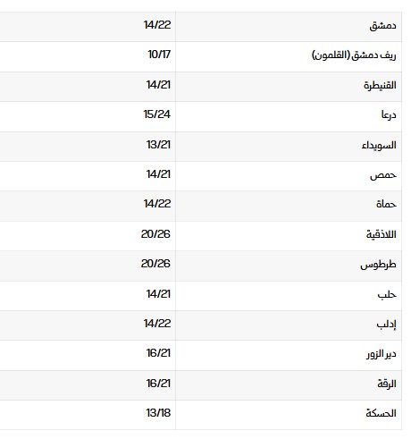 درجات الحرارة العظمى والصغرى في المحافظات السورية: