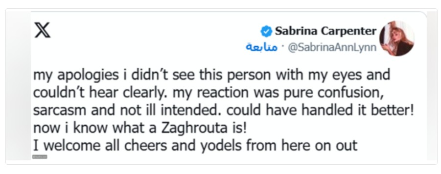 ورغم أن سابرينا كاربنتر قدمت اعتذاراً رسميا بعد الجدل الذي أثارته حول "الزغرودة" العربية، مؤكدة في منشور على "إكس" أن ما صدر عنها كان نتيجة ارتباك وسوء فهم، لافتة إلى أنها تعرفت لاحقا على معنى "الزغرودة"، وأنها مرحبة بجميع أشكال التفاعل في حفلاتها المقبلة. إلا أن منصات التواصل الاجتماعي تحولت إلى ساحة للاحتفاء بهذا الموروث الشعبي الأصيل، في رسالة اعتبرها ناشطون تعكس التمسك بالهوية والاعتزاز بالتقاليد الاحتفالية التي تميز المنطقة العربية عن غيرها من الثقافات العالمية. واختار مؤثرون على مواقع التواصل الاجتماعي الرد بأسلوب إبداعي يجمع بين الانتقاد والمرح. وقام مشاهير بنشر مقاطع فيديو متزامنة يطلقون فيها "زغرودة" مدوية كإهداء خاص لكاربنتر، بهدف تعريفها والجمهور الغربي بـ "جماليات هذا الصوت" الذي يمثل قمة البهجة في المناسبات السعيدة، مؤكدين أن الفن يجب أن يكون جسراً للتواصل وفهم الآخر وليس منصة لإطلاق الأحكام المتسرعة على ثقافات الشعوب.