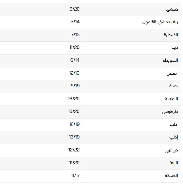 درجات الحرارة العظمى والصغرى في المحافظات السورية: