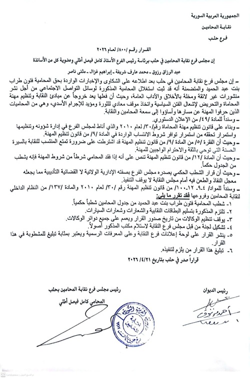سجلت نقابة المحامين في حلب أول قرار شطب بحق محامية، على خلفية نشرها محتوى مسيئاً عبر وسائل التواصل الاجتماعي، ما أثار تفاعلاً واسعاً بين رواد مواقع التواصل ، وأصدر مجلس فرع نقابة المحامين في حلب قراراً يقضي بشطب المحامية فتون طراب بنت عبد الحميد من جدول المحامين شطباً حكمياً، عقب ثبوت نشرها محتوى مسيئاً اعتُبر "مخالفاً لأخلاقيات المهنة ومسيئاً لسمعة المحاماة" عبر إحدى منصات التواصل. وبين القرار أن ما نُشر تضمن عبارات مسيئة وتحريضية، إلى جانب مواقف وُصفت بأنها تتعارض مع مبادئ النقابة وقواعد السلوك المهني، ما استدعى اتخاذ إجراء تأديبي مباشر بحقها.