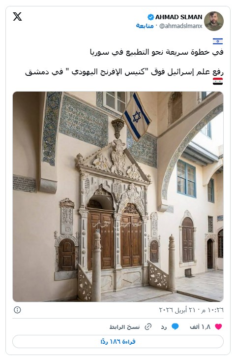 تداولت حسابات على مواقع التواصل الاجتماعي صورة قيل إنها تُظهر رفع علم إسرائيل فوق كنيس يهودي في العاصمة دمشق، وتحديدا على مدخل كنيس الإفرنج في حارة اليهود بالمدينة القديمة، فيما وُصف بأنه "خطوة نحو التطبيع". واتهم نشطاء الحكومة السورية بأنها تهرول نحو التطبيع، وحققت الصورة انتشارا واسعا على مواقع التواصل، في إطار محاولات تشويه صورة الحكومة وطرح رسائل توحي بوجود تطبيع مع الاحتلال الإسرائيلي.