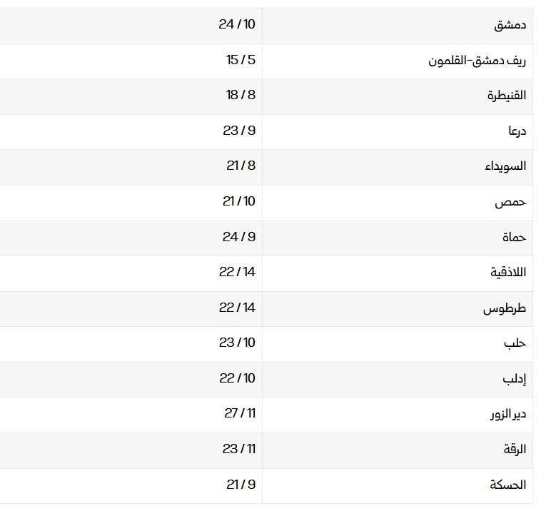 درجات الحرارة العظمى والصغرى في المحافظات السورية: