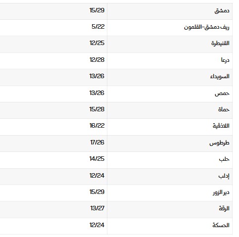 درجات الحرارة العظمى والصغرى في المحافظات السورية: